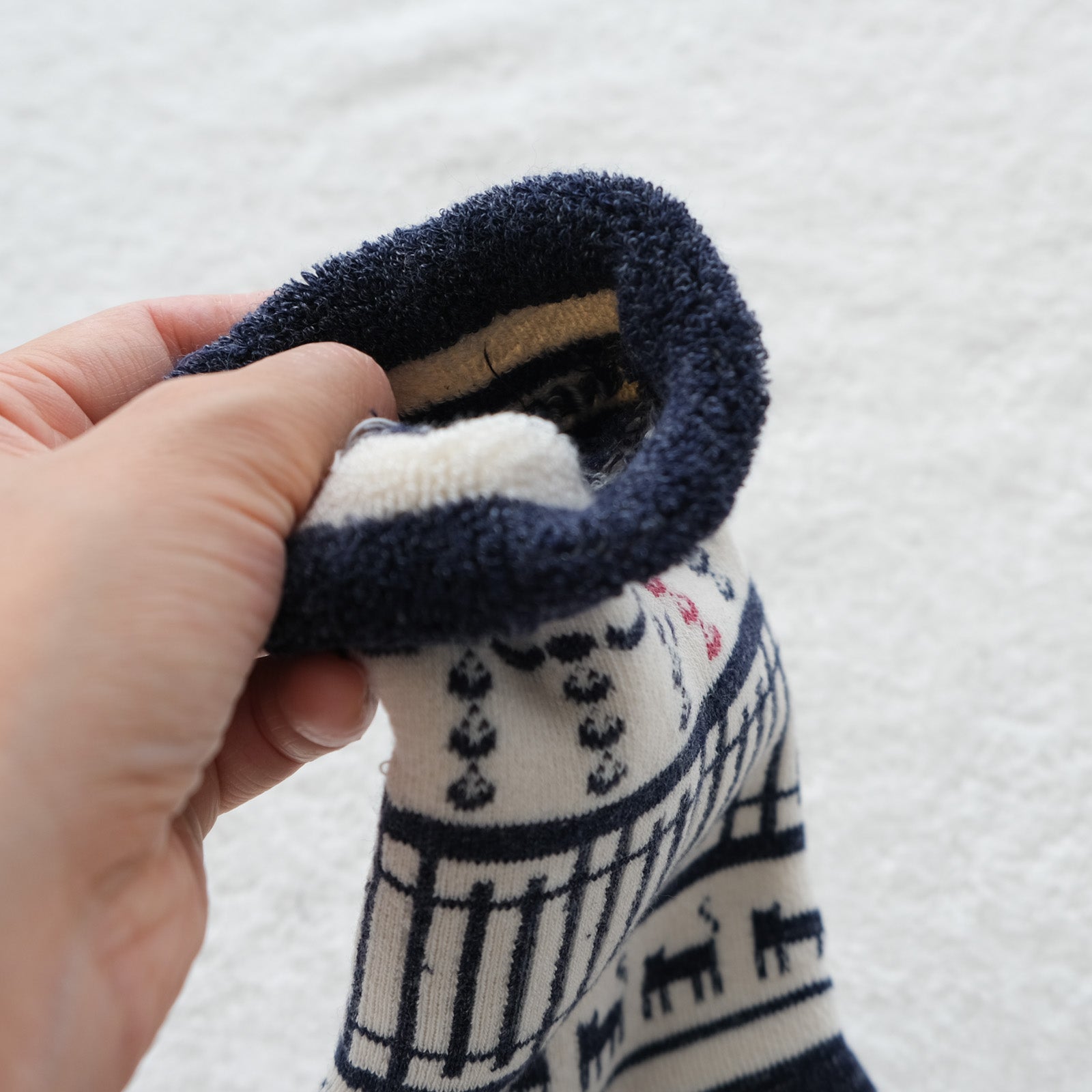 タオルのようなクッション性の高いパイル編みで作っており、とてもあたたかです。床からの冷えも通しにくいので、お風呂上がりなどのリラックスの場面にもおすすめ。